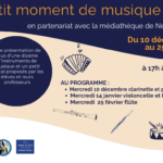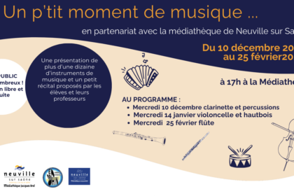 L’École de musique de Neuville-sur-Saône vous invite à ses Heures Musicales, un moment de partage et de découverte chaque 1er mercredi du mois, à partir de décembre 2025.